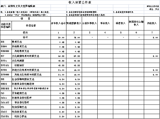 文学大世界编辑部2019年度收入总计80万元,比上年同期增加20.69万元,增长0.26%;支出总计80万元,比上年同期增加20.69万元,增长0.26%;。主要原因:人员工资、印刷费、稿费、职工工伤伤残补贴等费用的增加。