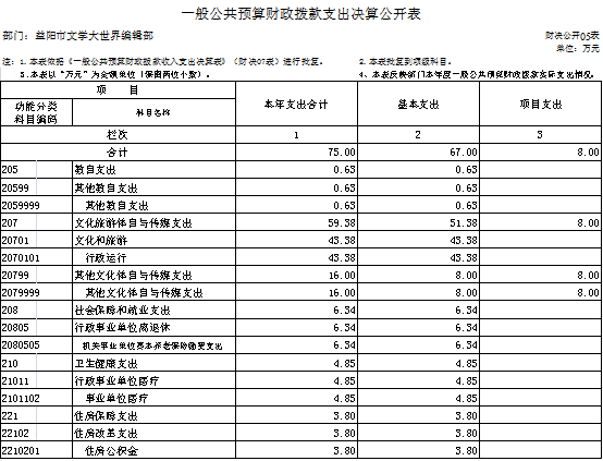 2019 年度财政拨款支出75万元,主要用于以下方面: 一般公共服务支出0.7万元,占 0.009%; 文化旅游体育与传媒支出(类)支出60万元,占75%; 社会保障和就业(类)支出6.3万元,占0.08%。