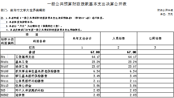 2019年度一般公共预算财政拨款基本支出67万元,其中人员经费支出67万元,主要包括基本工资、绩效工资、机关事业单位基本养老保险缴费、职工基本医疗保险缴费、其他社会保障缴费、住房公积金、其他工资福利支出、退休费;公用经费支出0元。