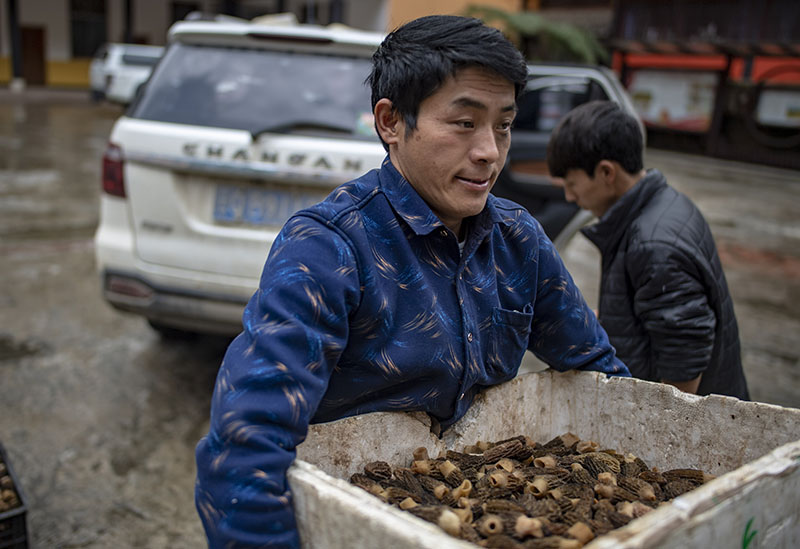 云南贡山县独龙江乡龙元村“致富能手”和晓永在乡里卖羊肚菌(2019年4月19日摄)。新华社记者 江文耀 摄