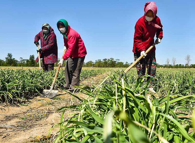 2020年5月11日,农民在山西省大同市云州区西坪镇唐家堡村边的黄花菜地里除草。新华社发(柴婷 摄)