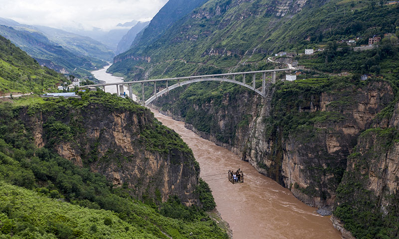游客们在体验云南省巧家县茂租镇鹦哥村村民蒋世学操作的溜索过江(2020年8月14日摄,无人机照片)。新华社记者 江文耀 摄