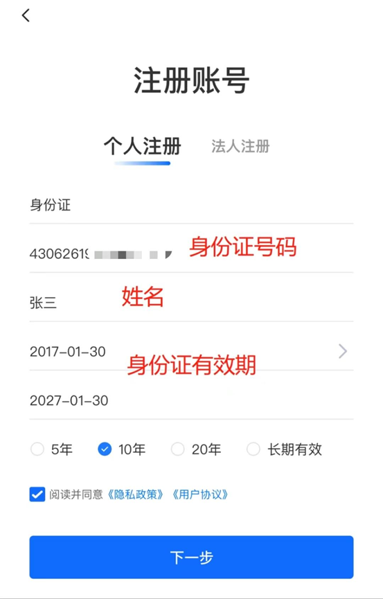 第8步:输入姓名、身份证号,根据身份证反面信息选择证件有效开始时间和身份证使用年限,点击“下一步”。