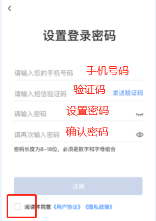 第9步:输入手机号,点击发送验证码,输入收到的验证码。设置登录密码,再次输入密码进行确认,勾选用户协议和隐私政策,点击注册后,便完成了注册。