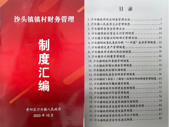 一是根据上级文件要求制定和完善镇级财政管理制度,将沙头镇镇、村财务管理制度整理汇编,印发成册,全面提升镇财政科学精细化管理水平;二是多方调研,率先制定《沙头镇村(社区)(股份)经济合作社财务管理制度》,规范村集体经济财务管理和运行机制,充分发挥财政在助力乡村振兴中的监督作用。