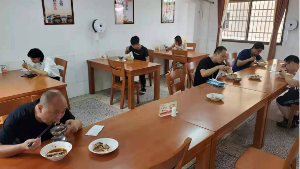 8月1日,午饭开餐之前,办公室刘志孝同志不停忙碌开来,负责将食堂的桌椅板凳按间距排开,通知中心全体干职工须按照楼层区分就餐时段,提倡错峰用餐、分散就餐,就餐时注意安全防护距离确保安全就餐。