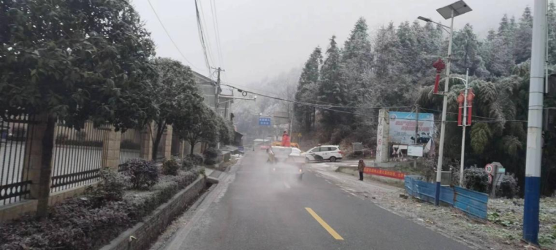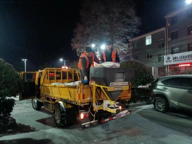 2月25日凌晨3时,益阳市安化县境内依然冰冻维持,气温更是骤降至零下1度,冰粒夹着冻雨再次向高明乡袭来。省道328线高明乡百花坳路段平均海拔618.8米,气温常低于其他地区3度左右,属易结冰路段,因低温雨雪而严重影响当地民众的安全出行;至凌晨4时许,路面积雪、结冰状况加剧导致湿滑难行。安化县梅城交通运输事务所接到当地冰情警报后,迅速组织力量赶往事发路段,在周师傅瞅着如镜面般的公路正一筹莫展时赶到了。到达现场后,抢险队迅速作出分工,一组人员将挂满了冰锥、压弯了腰、倒伏在公路上的竹木树枝砍断、移出路面,另一组人员指挥装载机用除雪铲将积雪推出路面、露出结冰层,最后一组人员则使用融雪撒布机、人工配合、撒布融雪剂融冰除雪,在这套组合拳下路面冰层开始融化。经过连续抢险作业,上午8时该路段全部抢通,交通恢复,现场没有车辆与人员滞留。