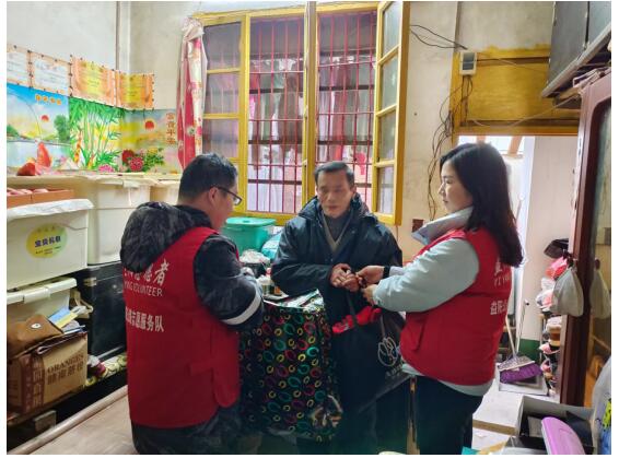 困难群众龚建明,患小儿麻痹症失去劳动能力,妻子智障患严重糖尿病,有一女儿读职业高中,家庭非常困难。志愿者从捐赠衣物中精心挑选了一些衣物,送到龚建明家中,并为其试穿,看是否合身。同时,了解其家庭现状,勉励他坚定信心,战胜困难,日子定会越来越好。龚建明连连表示感谢。