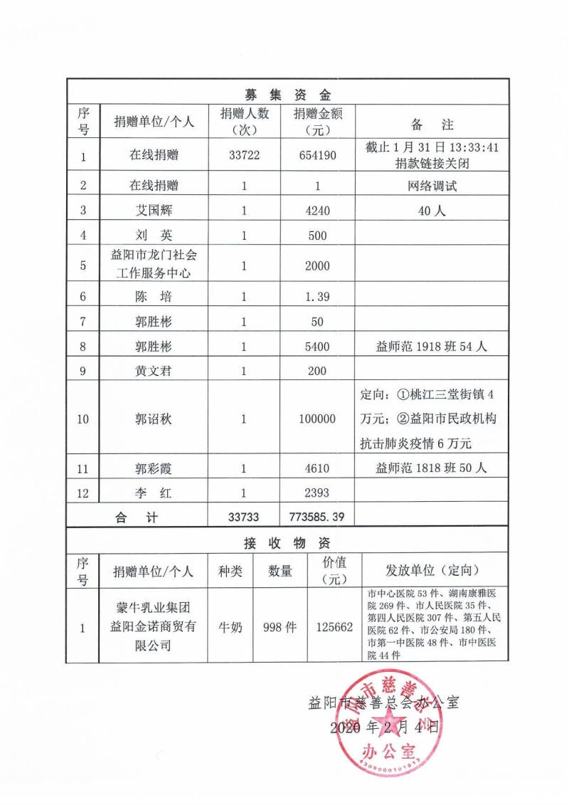疫情就是命令。益阳市慈善总会认真贯彻落实习近平总书记重要指示,积极响应党中央国务院、省委省政府和市委市政府的决策部署,根据《湖南省民政厅关于动员社会组织、慈善力量、志愿服务和社工组织依法有序参与新型冠状病毒感染的肺炎疫情防控工作的公告》,于1月28日发布《关于抗击“肺炎疫情”募捐倡议书》(项目在民政部“慈善中国”网备案号:514309007790067470A2001),接收社会捐赠。自2020年1月28日至2月2日止,收到捐款33733笔总额77.358539万元,物资折价12.5662万元。本次募集的所有善款善物由益阳市委新型冠状病毒感染的肺炎疫情防控工作领导小组办公室统筹安排使用(定向捐赠除外)。现将第一批捐款捐物情况公示如下: