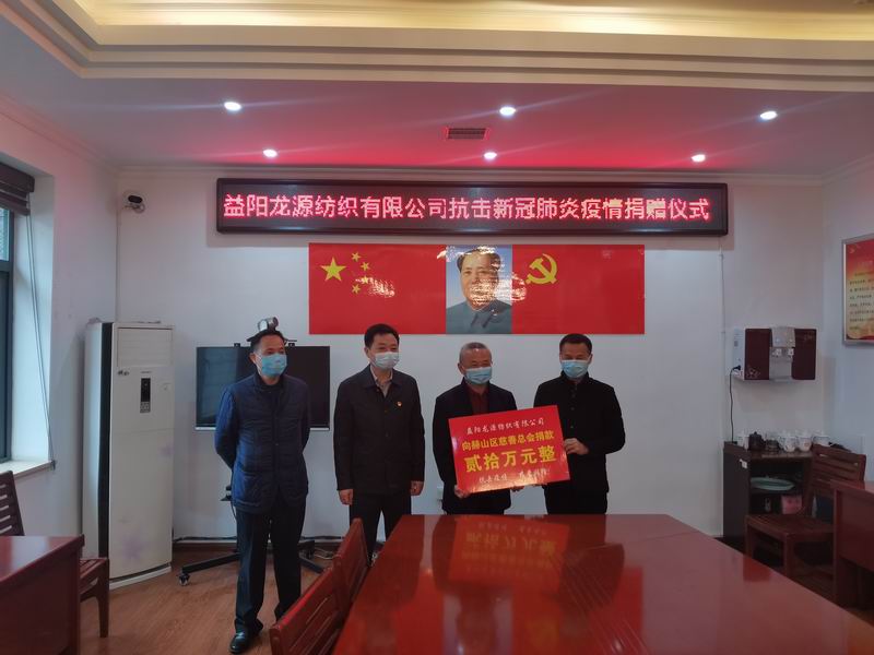 一方有难,八方支援。面对新冠肺炎疫情防控严峻形势,益阳龙源纺织品有限公司在做好企业和员工防护、积极组织复工复产的同时,积极投身疫情防控工作,切实履行企业的社会责任,公司董事长陈建军亲自将20万元现金送到益阳市赫山区慈善总会,并表示:“受疫情影响,虽然企业订单有的被迫取消,有的延期,给企业带来了不少的损失,但在这个非常时期,我们在做好各项防疫措施的基础上,即使企业再困难,也要尽一分社会责任,为打赢这场战‘疫’尽绵薄之力。”