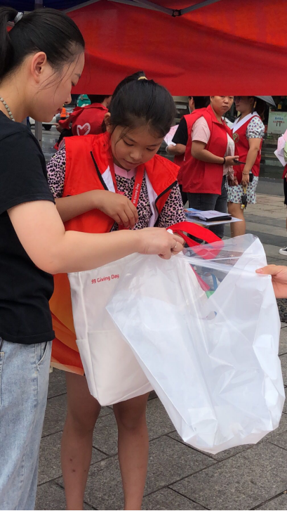 “叔叔,阿姨,爷爷,奶奶,你们可以扫下这个二维码吗?只需捐一元钱就可以了,这个钱将帮助留守儿童、老年人等特困群体”,一位身穿大红色马甲的小小志愿者,手里拿着“益行益善 益老益小”腾讯99公益日募捐暨“慈善一日捐”倡议书,努力地向过路的群众解释说道。