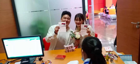 据南县婚姻登记服务中心窗口工作人员介绍,疫情期间积攒了不少登记量,准新人们早早把结婚登记计划放在了520和521这两天,并提前进行了预约。“早在一周前,网上预约已饱和,‘520’‘521’这两天总共预约了50对。”婚姻登记员聂宏说。据了解,南县婚姻登记服务中心为了应对登记高峰,增设了电脑高清采集仪和打印机等设备,并根据登记办理速度等因素,合理测算预约量,科学分配登记窗口,设立了预约登记专办窗口,新人贺达峰和涂静手持预约单在专办窗口前排队,“我们两周前就在网上办理了预约登记业务,提前预约,提前办理,方便快捷。”