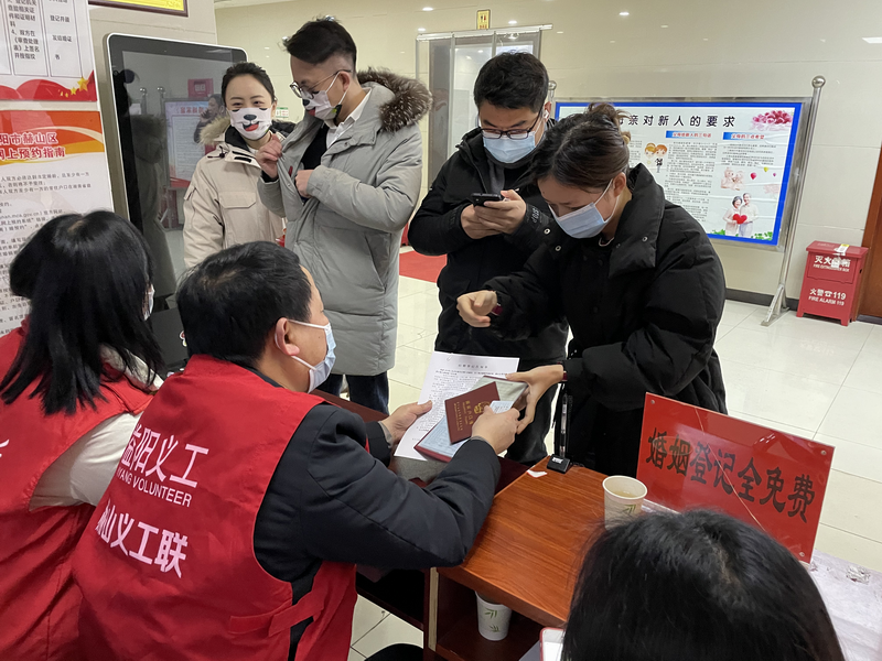 据了解,截止笔者发稿时,就有160多对新人办理结婚登记。为把新人们的大事喜事办好办实,赫山区民政局将特殊日子的婚姻登记工作纳入“我为群众办实事”的重要内容,做到早筹划、早安排,制定工作预案,发布“全市通办”通告,引导群众电话网上预约、错峰办理、自觉做好疫情和安全防护,倡导新婚文明节俭,破除陈规陋习,做新时代家庭和谐的模范。