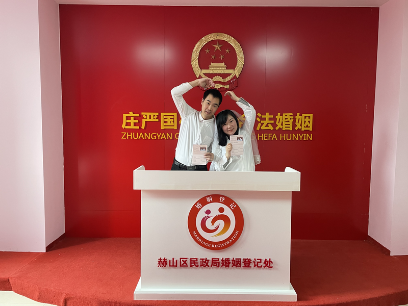 “我们是通过网上预约来领证的,我和爱人是在旅游的时候认识,相知相爱五年多,一直在等着这个特殊日子,盼着我们以后两心相悦,比翼双飞,一起创造幸福美满的日子。”这对浪漫的新人,男方来自河北遵化,女方是湖南益阳本地人,幸福之情溢于言表。