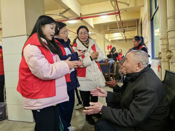 学生们唱红歌活动拉到了活动的高潮。他们与老人们一起唱响经典红歌,《没有共产党就没有新中国》《我和我的祖国》等一首首耳熟能详的歌曲回荡在大厅。老人们跟随着节奏轻轻哼唱,脸上洋溢着幸福的笑容,现场气氛热烈而温馨。