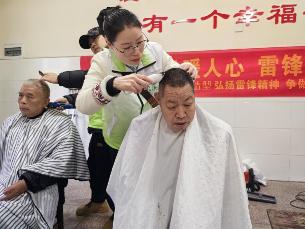 与此同时,义剪义诊区域也在有序进行。专业理发师志愿者耐心询问老人们的理发需求,手法娴熟地为他们修剪头发,让老人们容光焕发;医疗志愿者则仔细为老人们测量血压、血糖,进行健康检查,并耐心解答老人们的健康问题,给予专业的健康指导和建议。