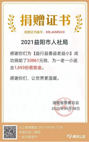 据统计,截止2021年9月8日,全系统干职工通过腾讯公益平台为“益行益善 益老益小”成功捐助了33861元钱,为一老一小送去了1693份救助金。(规划财务科)