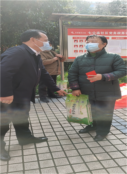 2022年春节将至,为使困难群众度过一个欢乐祥和的节日,1月19日,益阳市人社局党组副书记、副局长涂大军带领党员志愿者到联点七公庙社区开展春节慰问和疫情防控宣传活动。
