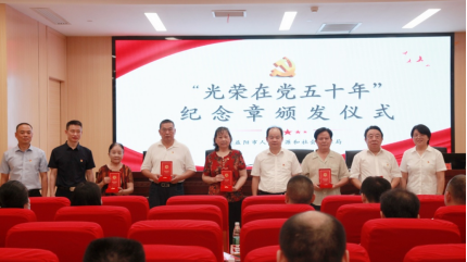 会上,肖凤南同志为王振明、张胜利、成群桂、陈又生、罗景亮5位党龄达到50周年的老党员颁发了“光荣在党50年”纪念章,把荣誉送到老党员的手上,把党中央的关爱送到老党员的心中。五十载初心如磐,小小的纪念章承载了老党员、老同志们始终肩负着一名共产党员的使命,为党和人民奉献的宝贵年华,以及为人社事业发展做出的卓越功绩。激励新时代党员干部要牢牢接过时代的接力棒,立足岗位,脚踏实地,接续奋斗。