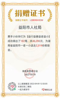 据统计,截至2022年9月9日中午12时53分,市人社局携手小伙伴们为【益行益善 益老益小】成功捐出善款182笔,共46396元,为益阳市一老一小送去了2319份救助金。(局规划财务科 樊映丽)