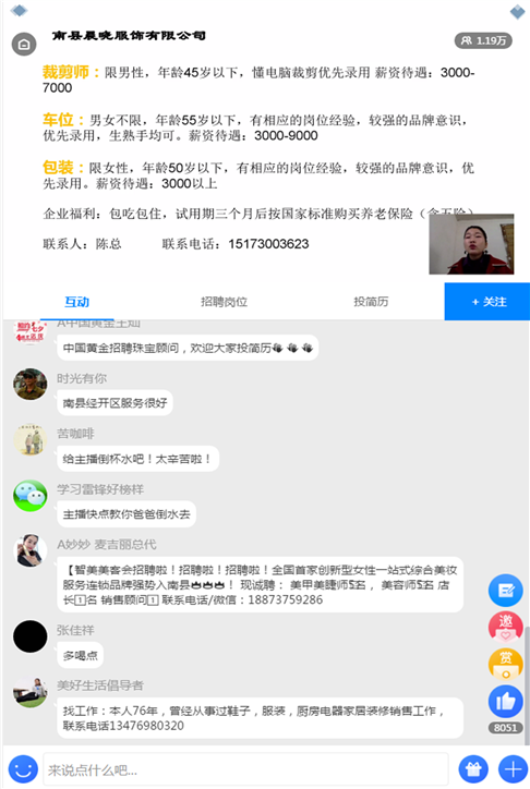 “女,44岁,在富士康做了5年仓管员,有类似的岗位吗?”“请问步步高招聘文员有什么要求吗?”近日,南县人社局依托湘域人力资源网络平台,在电脑和手机移动端同步直播了一场视频招聘会,共吸引 2万余名求职者在线观看咨询。