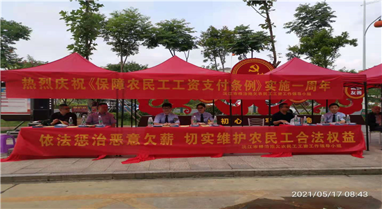 5月17日,在《保障农民工工资支付条例》实施一周年之际,沅江市人社局进一步落实“我为群众办实事”党史学习教育,由沅江市劳动监察局会同在建工程行业主管部门以及沅江市高新区开展《保障农民工工资支付条例》实施一周年普法宣传活动。
