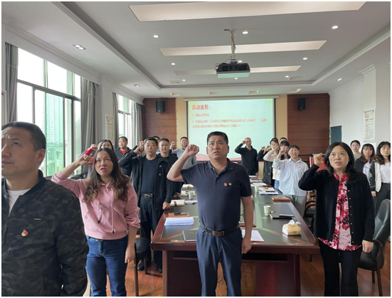 活动一开始,该支部全体党员面对党旗,庄严地举起右拳,在支部委员龚剑的领誓下,重温了入党誓词:“我志愿加入中国共产党,拥护党的纲领,遵守党的章程,履行党员义务,执行党的决定,严守党的纪律,保守党的秘密,对党忠诚,积极工作,为共产主义奋斗终身,随时准备为党和人民牺牲一切,永不叛党。”