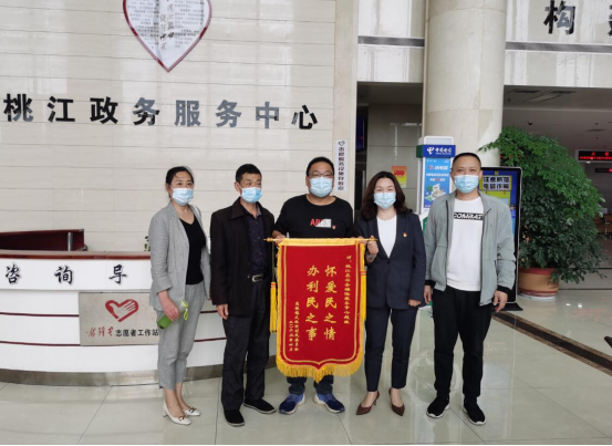 近日,高桥镇大林村第一书记胡应清、村支书刘金奎带领村“两委”班子成员来到桃江县政务服务中心,将一面印有“怀爱民之情、办利民之事”的锦旗送到桃江县社会保险服务中心选派的驻村工作队员赵政同志手中。