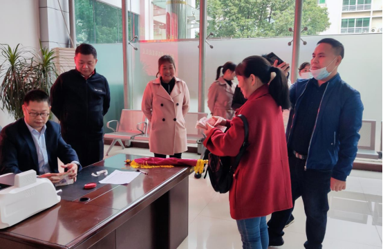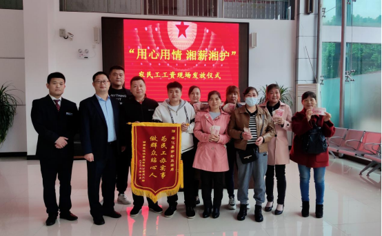 10月9日,安化县人社局大厅里谌再喜等8名劳动者激动地紧握住劳动监察员的手,送来一面写有“为民工办实事,做群众贴心人”字样的锦旗,感谢安化县人社局劳动监察部门为他们追回被拖欠的6.3万余元工资。