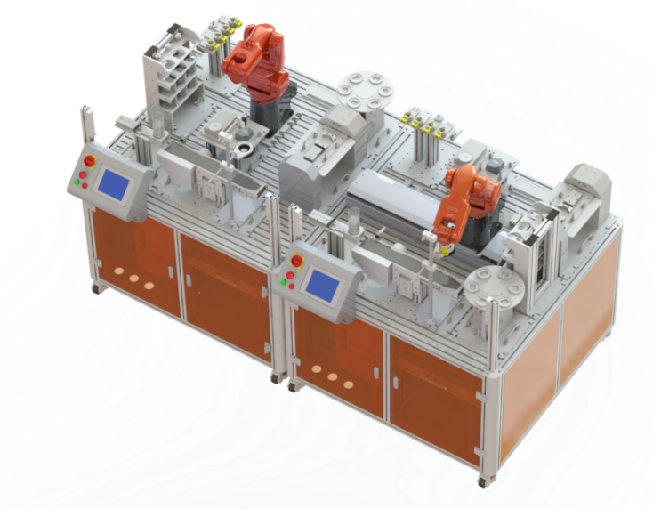 标准工作台以更加适合操作员操作习惯的位姿,固定了机器人及其外部设备设施的安装高度,同时为工业机器人控制柜、机器人外部设施电气控制元件提供安装孔间,并能够容纳空气压缩机等,标准工作台采用标准工业铝型材搭建,工业机器人及其外围设备设施均采用标准型材配件连接,拆卸和部署方便快捷。