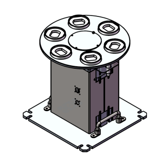 旋转供料模块具有6个工件放置位,沿圆盘圆周方向阵列。旋转供料装置采用步进电机驱动,由PLC控制其运动,配置1:80速比的谐波减速机,运动平稳,精度高。旋转供料平台配置零位校准传感器、工件状态检测传感器。