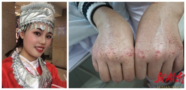 (湖南省儿童医院感染科护士胡佩在隔离病房工作4天后,双手终日用84消毒液、洗手液、滑石粉、酒精消毒液浸泡着,最终变成了这样。资料图片)