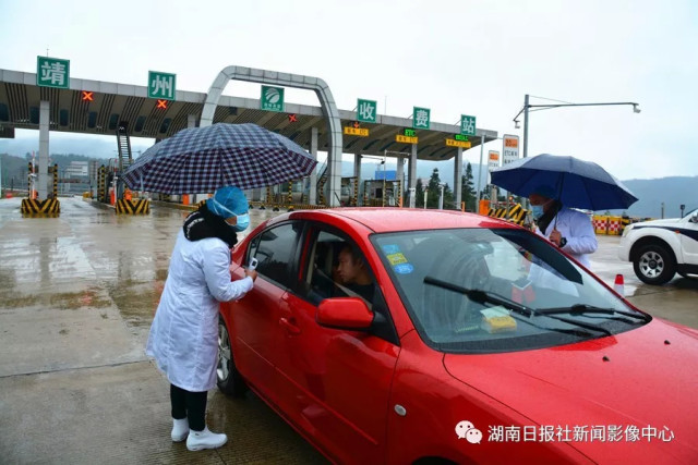 (1月25日,包茂高速靖州收费站出口,靖州苗族侗族自治县公安、公路、交通、卫生防疫等部门设立疫情防控检查点,工作人员冒雨对入境车辆所有驾乘人员进行体温检测、登记)