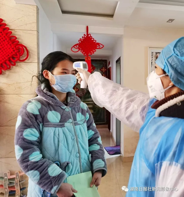 (1月26日,临澧县安福街道朝阳街社区,医务人员上门给湖北返湘检测体温,发放防疫宣传单。为切实做好新型冠状病毒感染的肺炎疫情防控工作,该县安排380余名医务人员,每天对全县160个村(社区)的湖北返湘或来湘人员进行体温检测和观察)