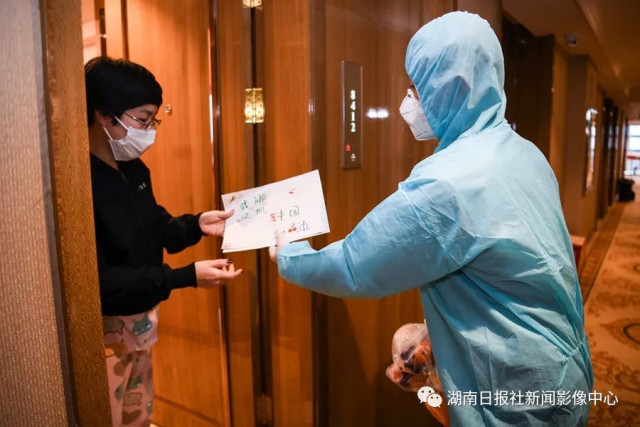 (1月30日,长沙市开福区秀峰街道,基层党员贺伟毅在定点服务场所为湖北省来湘人员送水果、盒饭,并一同送上志愿者绘制的祝福图,为他们鼓劲加油)