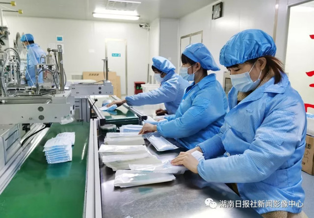 (1月25日20时,临澧县经济开发区永康医疗器械有限公司,工人在生产口罩。当天,该公司30余名员工放弃休假,24小时加班赶制普通医用口罩,助力新型冠状病毒肺炎疫情防控)