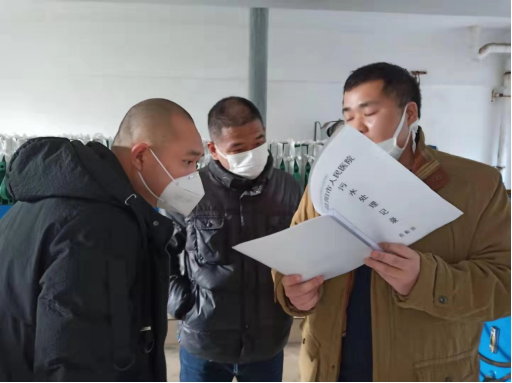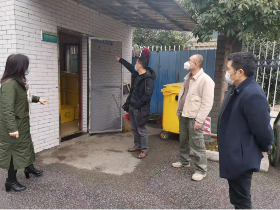 图为:陈万川(右二)在对某医疗机构进行现场检查时,指出医疗废物暂场所存在的问题
