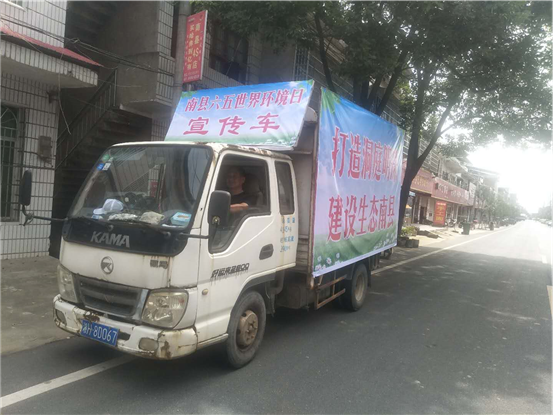 张贴标语的宣传车辆循环播放《世界环境日:致全县人民的一封信》