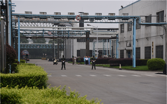 上午9点,演练在纳爱斯公司液碱储罐区拉开序幕。当巡查人员发现围堰区内有大量不明液体,立即排查。到3#液碱储罐时,发现罐体穿孔,罐内存储的液碱泄漏,当即撤离到安全区域,并立即向应急指挥部报告。纳爱斯公司迅速启动Ⅱ级(厂区级)预警响应,随即组织各职能小组按照应急预案执行。救援组、检测组、事故调查和善后处理组等井然有序地履行各自的职责。在指挥部及各演练小组密切配合下,圆满完成了本次演练。