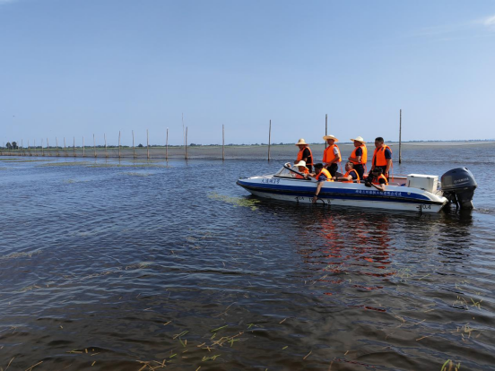 潘碧灵一行先后前往金盆河节制闸、大新河入湖口人工湿地开展调研,详细了解了工程建设、使用情况,并乘船深入大通湖水域察看湖体水质及藻类水华处置情况。