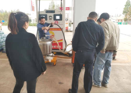上图为:益阳市生态环境局大通湖分局委托第三方检测公司对益阳市大通湖区某加油站汽油加油枪进行现场检测。