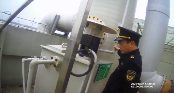 上图为:益阳市生态环境局执法人员用pH试纸对该单位废气处理设施碱液储存池进行检测。