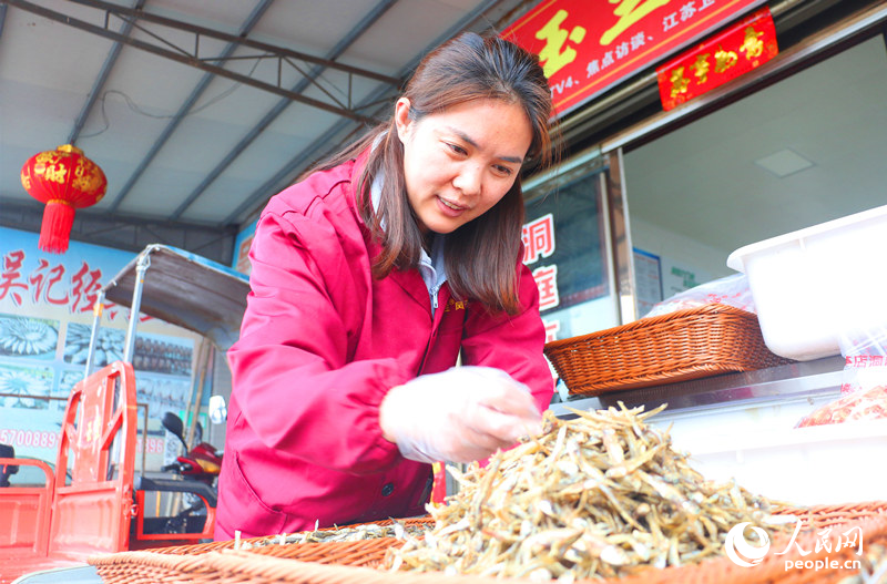 刘静在整理店铺里的小鱼干。人民网记者 刘宾摄