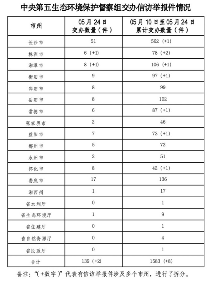5月24日,中央第五生态环保督察组向我省交办第15批群众信访举报件,共有139件,其中重点件25件。