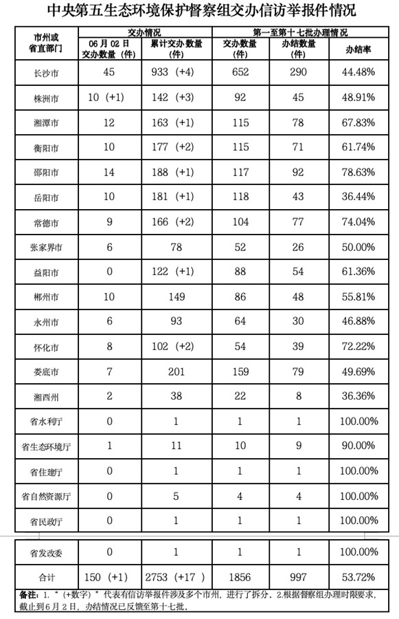 截至6月2日,对中央第五生态环境保护督察组向我省移交的第十五批群众信访举报件139件,各责任单位均按要求进行了调查处理。