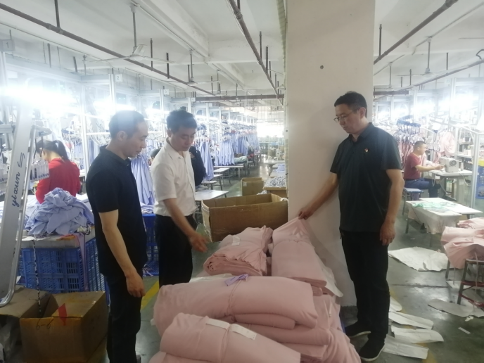 胡建军一行先后来到湖南旭荣制衣有限公司、湖南凯特密欧服饰有限公司,深入生产一线与企业负责人进行交流和探讨,宣讲纤维检验标准和技术服务新内容、新特点;详细讲解学生校服、床上用品检验标准,对检验过程中可能出现的产品质量问题提出建议和解决办法。