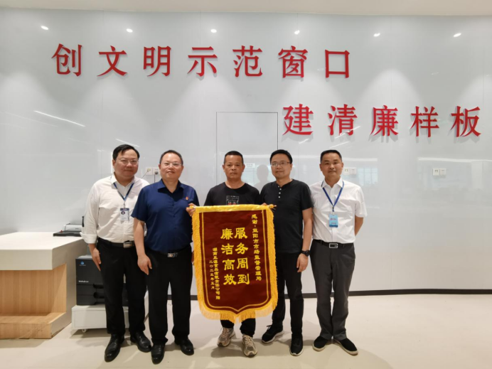 5月26日,湖南丘源食品有限责任公司代表来到市市民服务中心市场监管食品生产许可服务窗口,将一面“服务周到、廉洁高效”的锦旗送给窗口工作人员,感谢工作人员的优质、便捷、高效服务。正在窗口开展“走流程、解难题、优服务”体验活动的市局党组成员、副局长周魏宏代表市局接受赠旗。