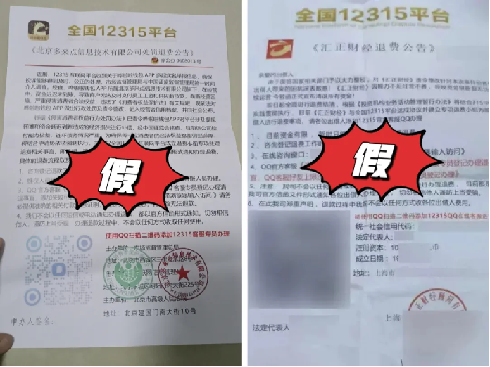 近日,不少群众反映,遭遇了退款诈骗“新套路”。诈骗分子自称是“12315”维权平台的客服,以“维权”“退款”为由进行诈骗。益阳市市场监督管理局郑重提示:全国12315平台不提供第三方维权退费或协助退费渠道,也不会提供国库券等理财产品。如收到以下退费公告,可直接向公安部门报案。