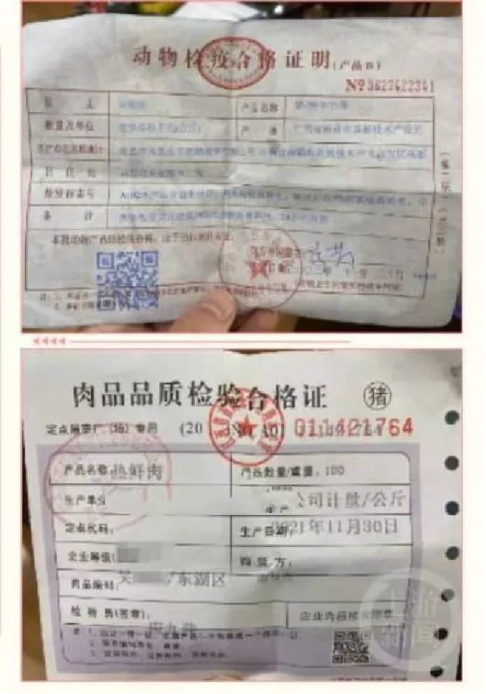 二、细查检疫检验证明 确认经营者售卖的肉品有“两证两章”:经营者能提供所售肉品动物检疫合格证、肉品品质检验合格证及猪肉胴体等部位有动物产品检疫合格印章、肉品品质检验合格验讫印章。
