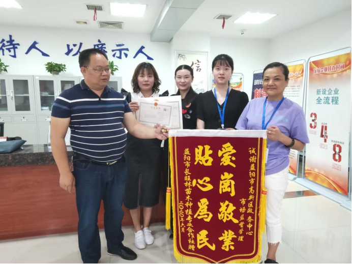 6月3日上午,益阳市长旺林苗木种植专业合作社将一面印有“爱岗敬业 贴心为民”的锦旗送至高新区政务中心市场监督管理局注册登记窗口,表达对注册登记窗口工作人员热情、优质、便捷、高效服务的感谢。